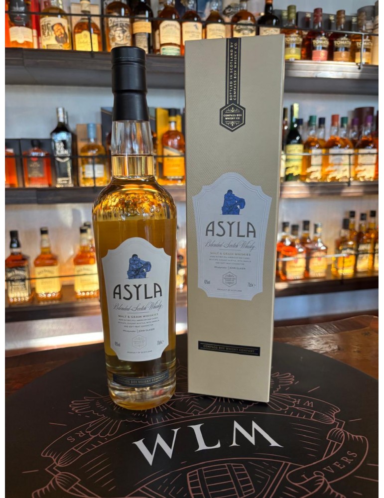 Mezcla producida por la cia Compass Box. A diferencia de la ancestral tradición escocesa, esta joven empresa fue fundada en el año 2000 por John Glaser, ex director de marketing de Johnie Walker, al creer que podía confeccionar mezclas de mejor calidad que su antiguo empleador. Hoy es una de los embotelladores independientes más reconocidos del mundo. ASYLA es el plural de asilo, palabra que sugiere delicado equilibrio entre manicomio y santuario. Considerado el Chardonnay de los blends por su suavidad y frutalidad. Uno de los pocos blends del mercado en contener un 50% de malta en su composición (Glen Elgin, Linkwood).